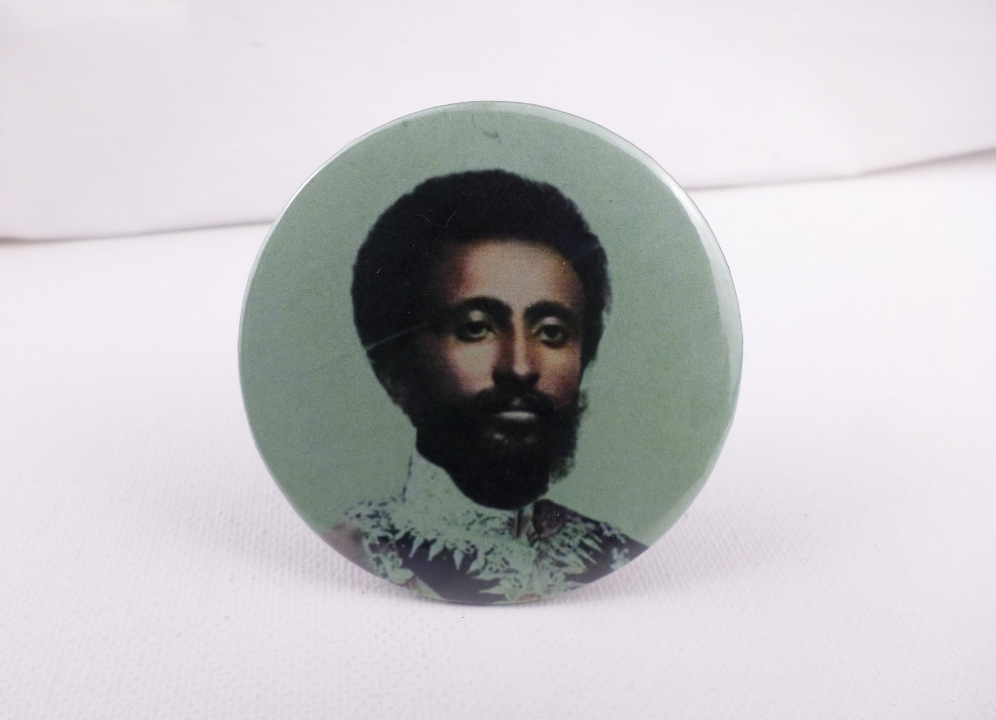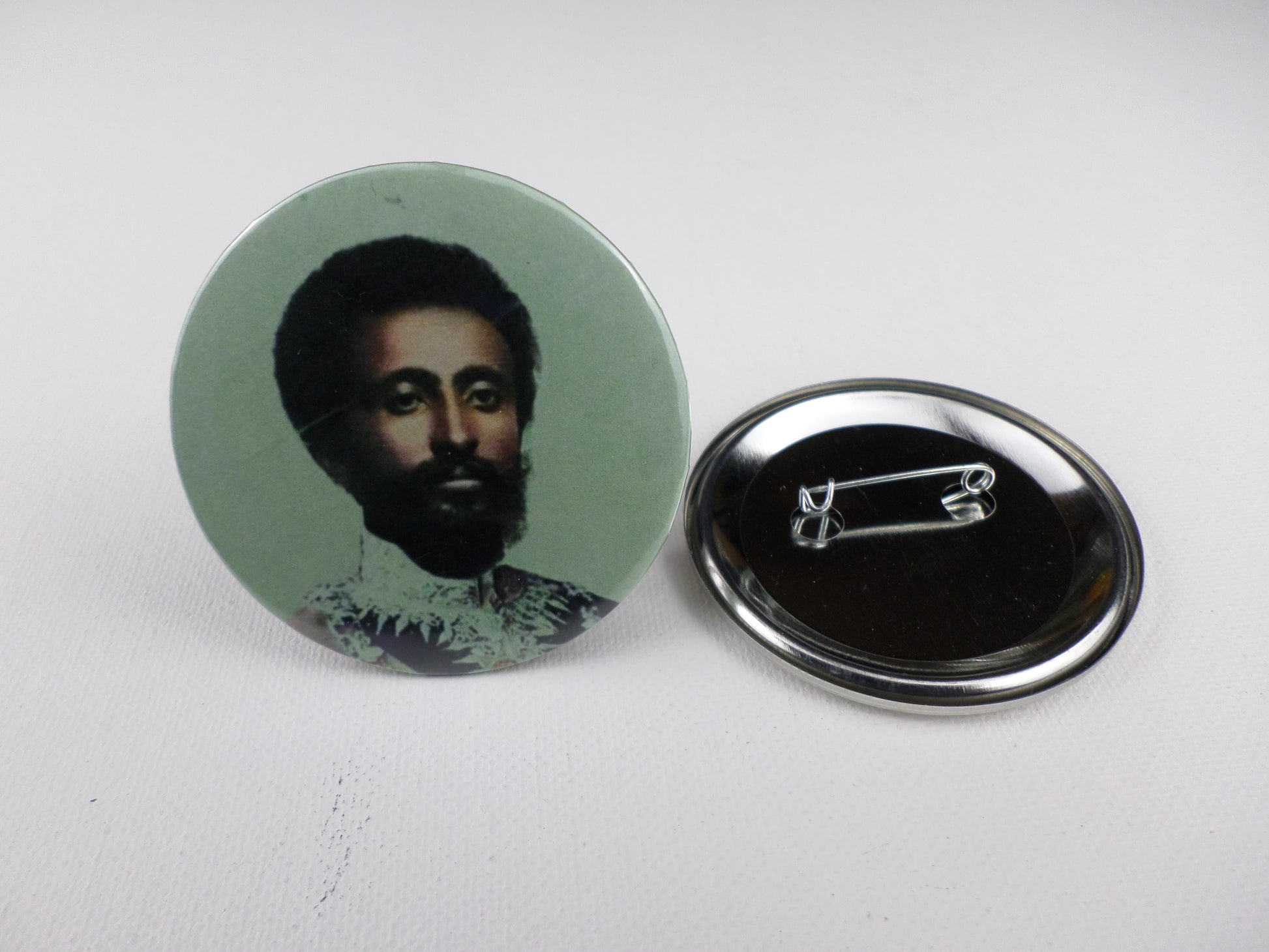 Custom Buttons from the Haile Selassie collection by Rasta Wearhouse. 2.28" Diameter Button, Spring Lock Pin packaged loose, ready to wear or share.