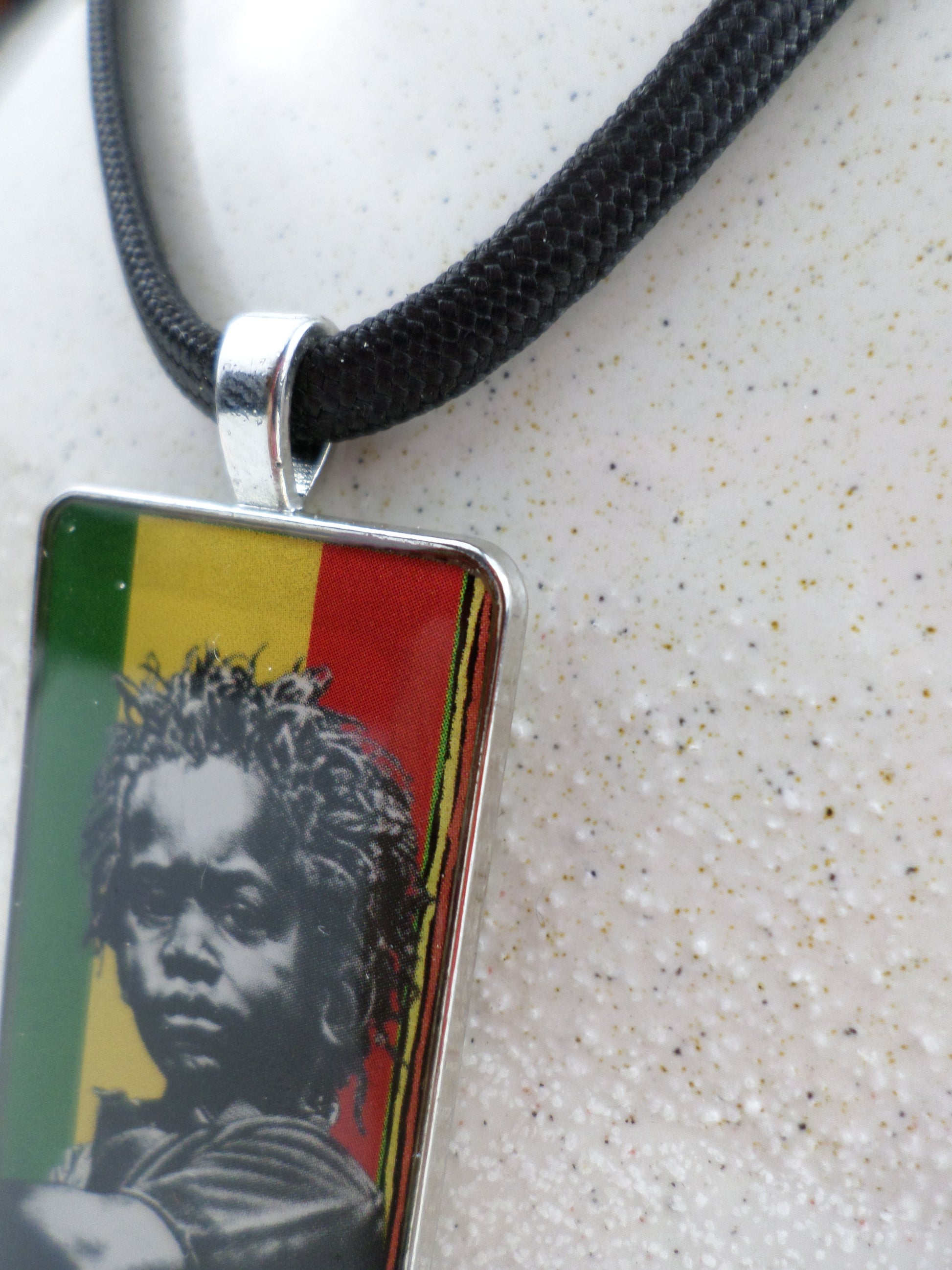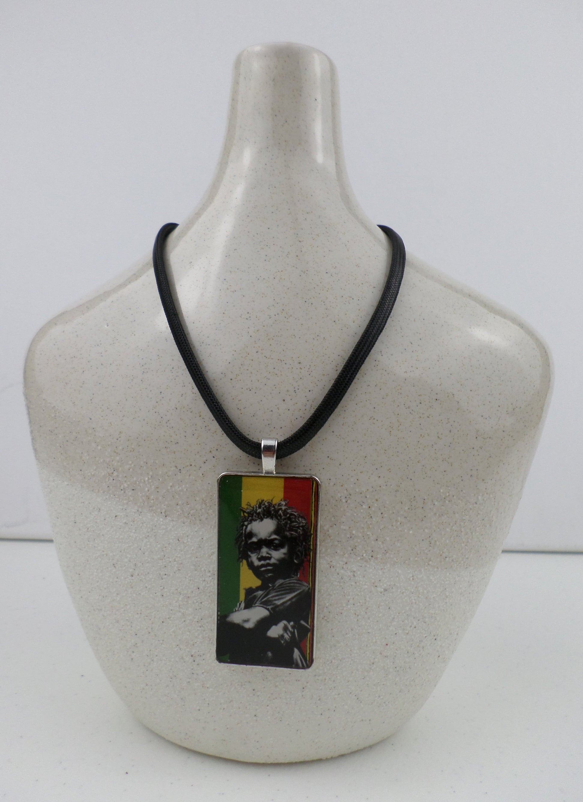 This 24" corded necklace features a resin filled pendant showcasing Rasta Baby