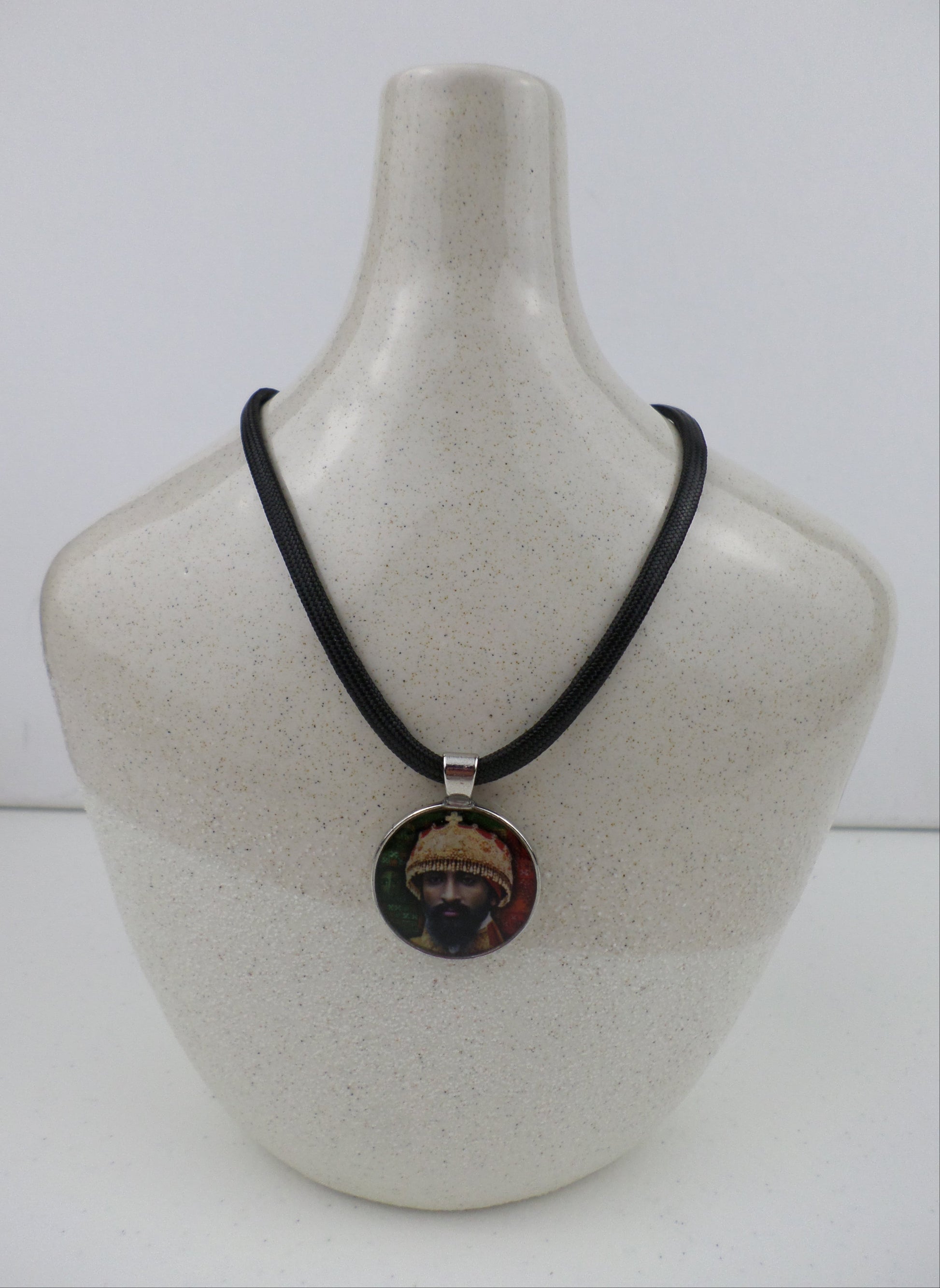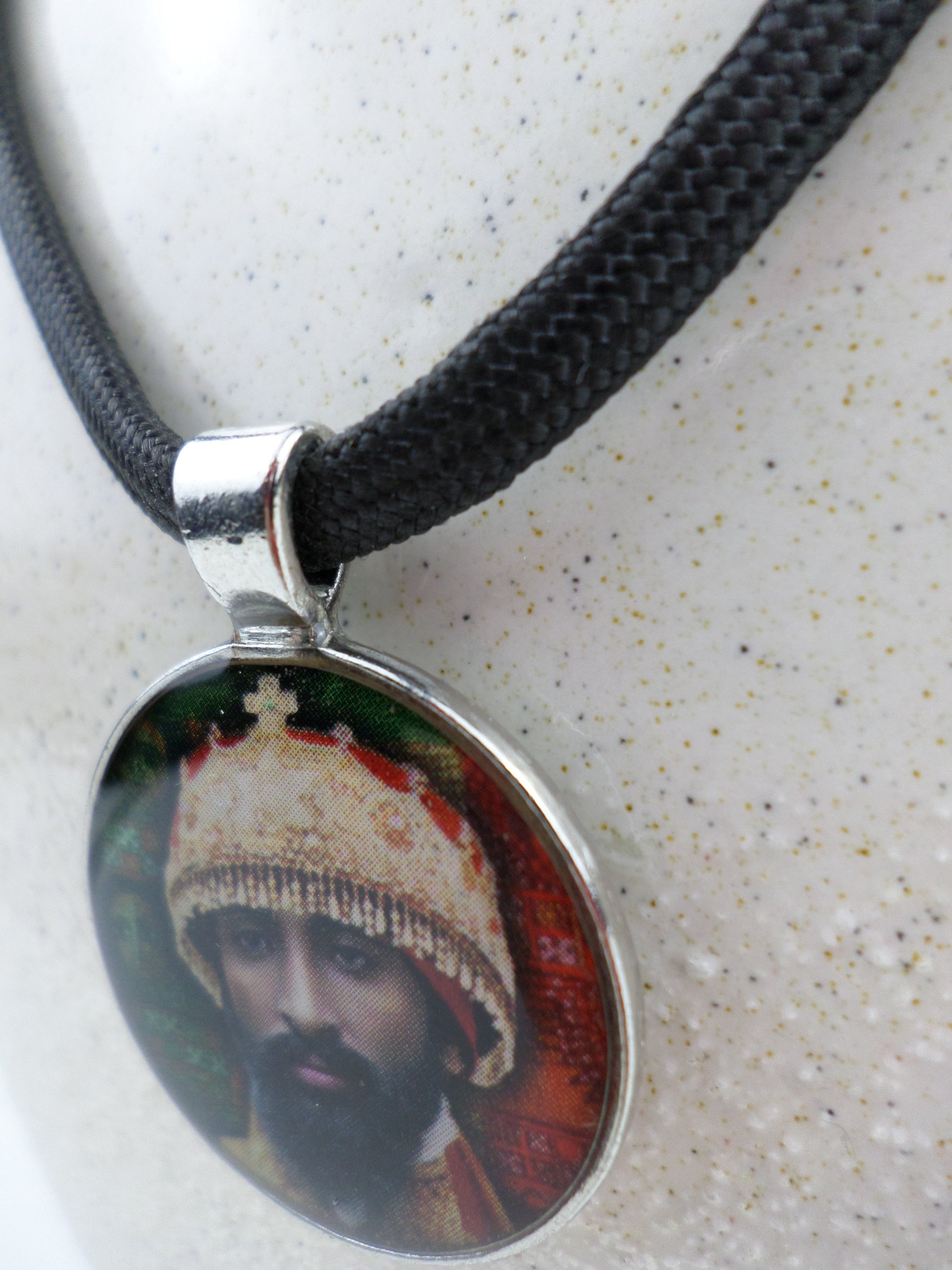 This 24" corded necklace features a resin filled pendant showcasing H.I.M. of Ethiopia