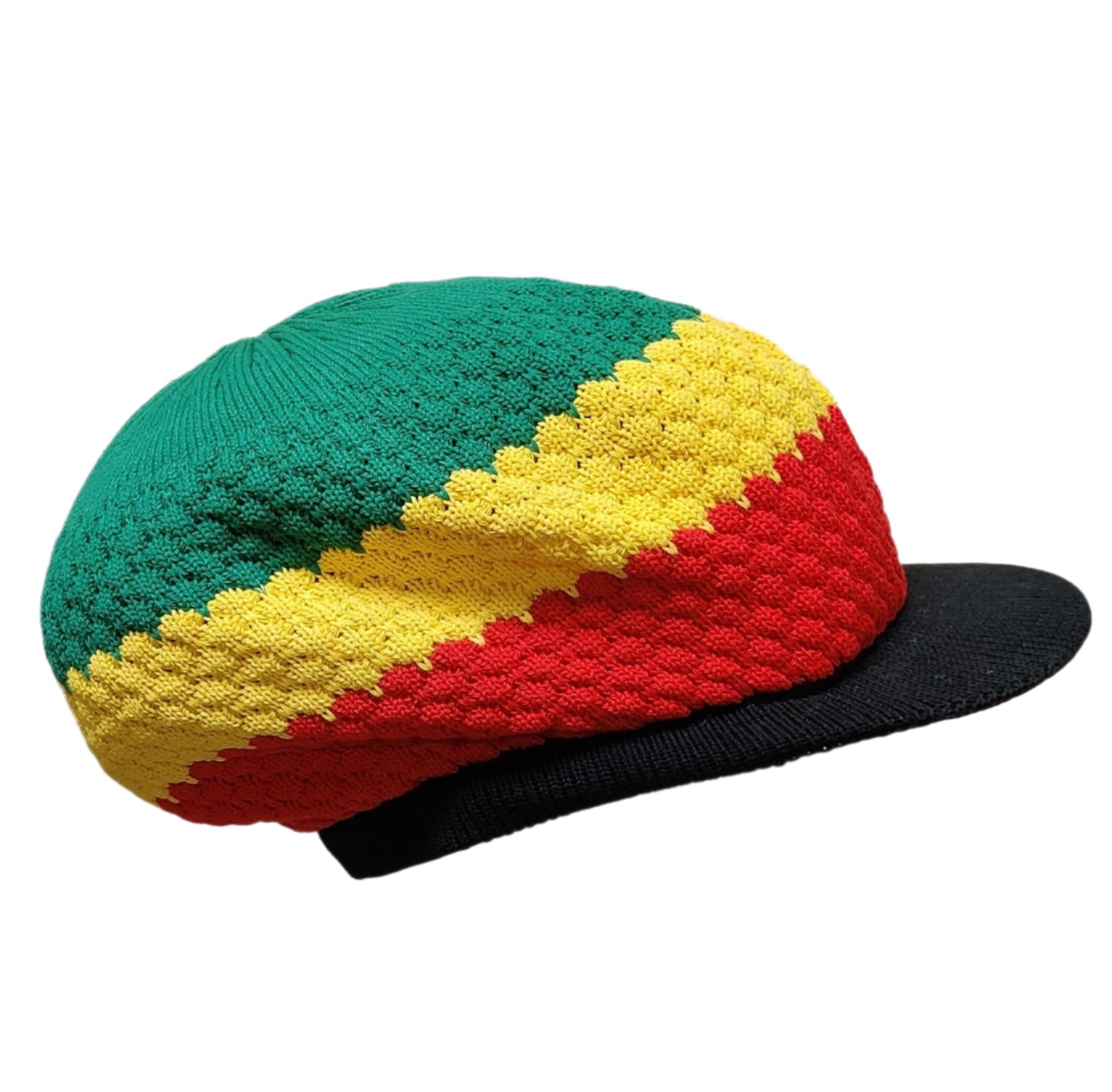 1-010036 Rasta Dreadlocks Cap Tam Hat with Brim (Red, Gold, Green & Black)