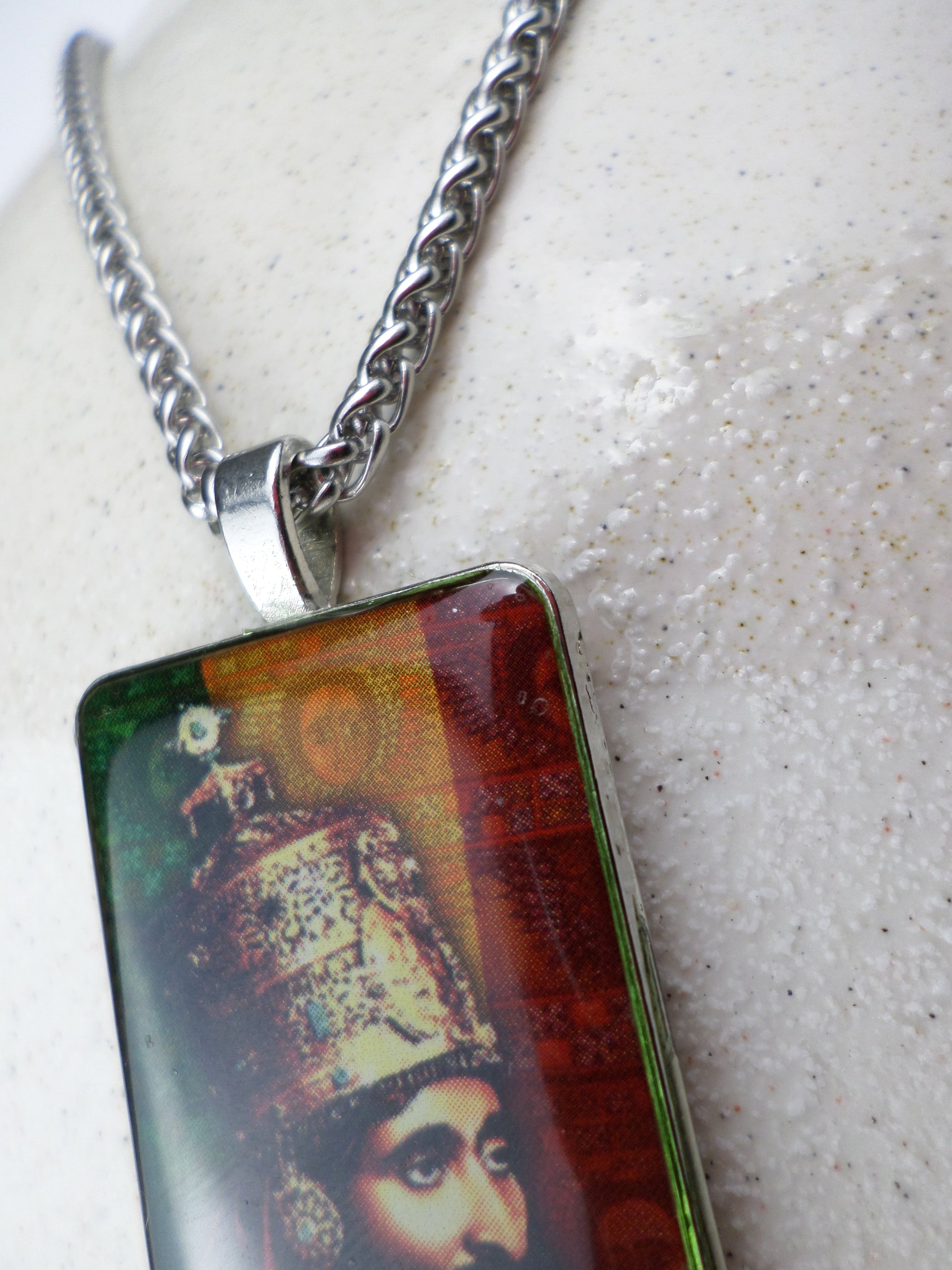 This beautiful (3mm) 24" stainless steel wheat chain features a resin filled pendant showcasing His Imperial Majesty - Emperor Haile Selassie I.