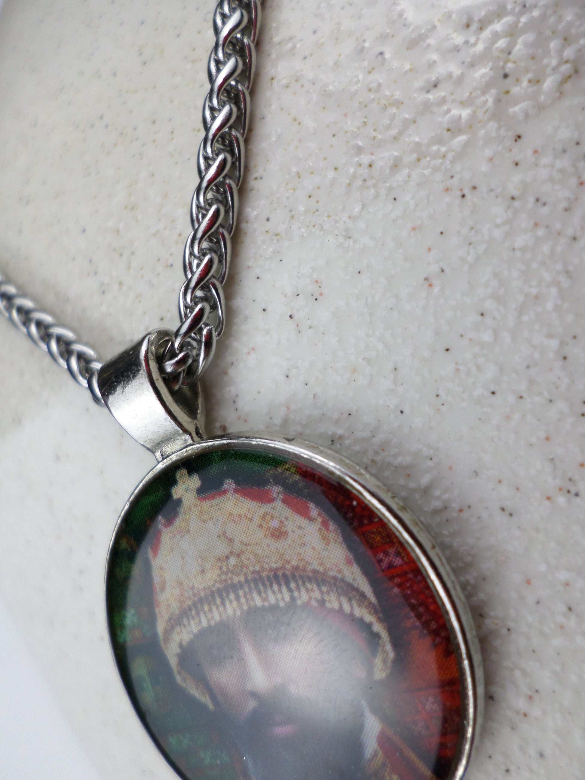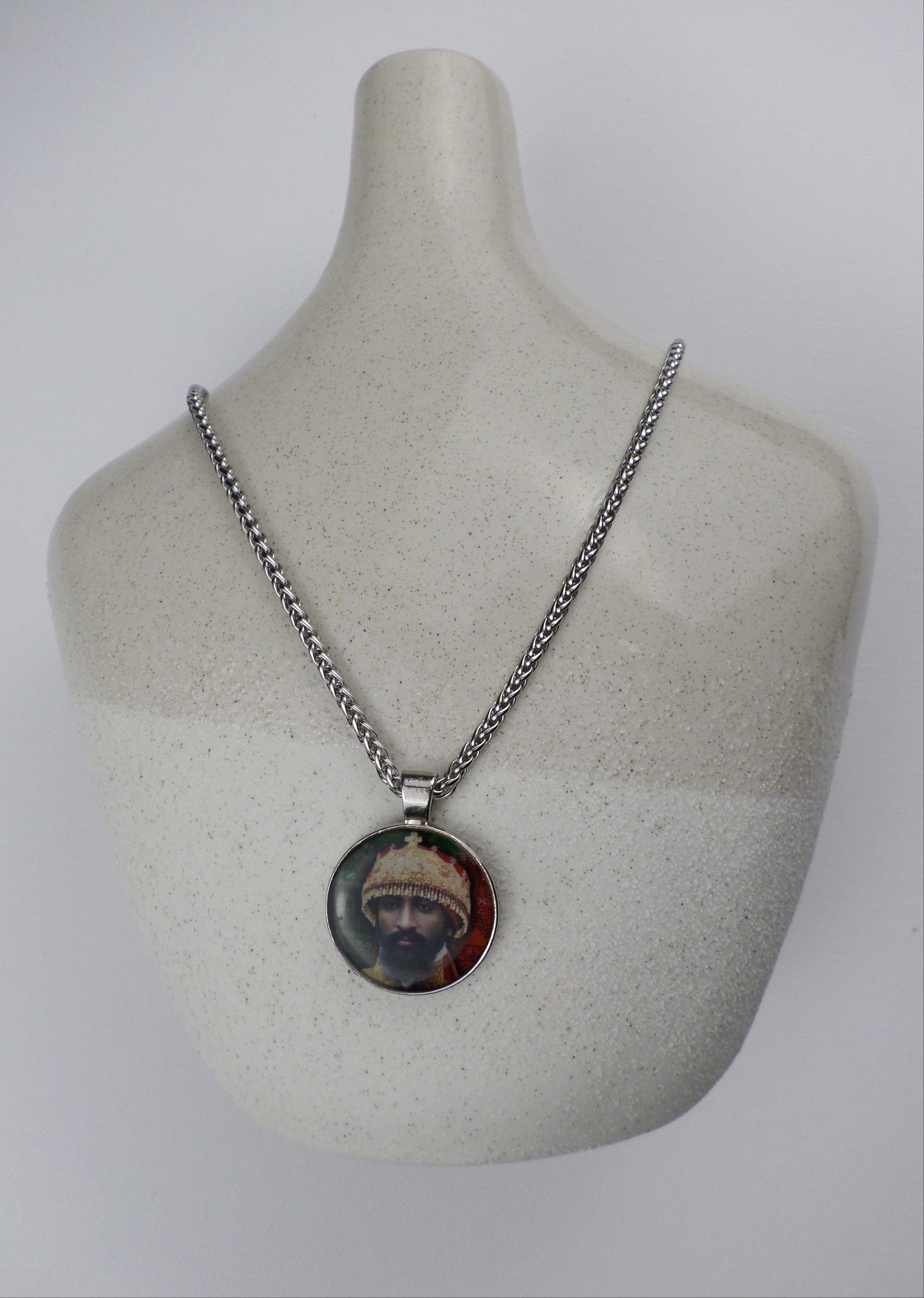 This beautiful (3mm) 24" stainless steel wheat chain features a resin filled pendant showcasing H.I.M. of Ethiopia.