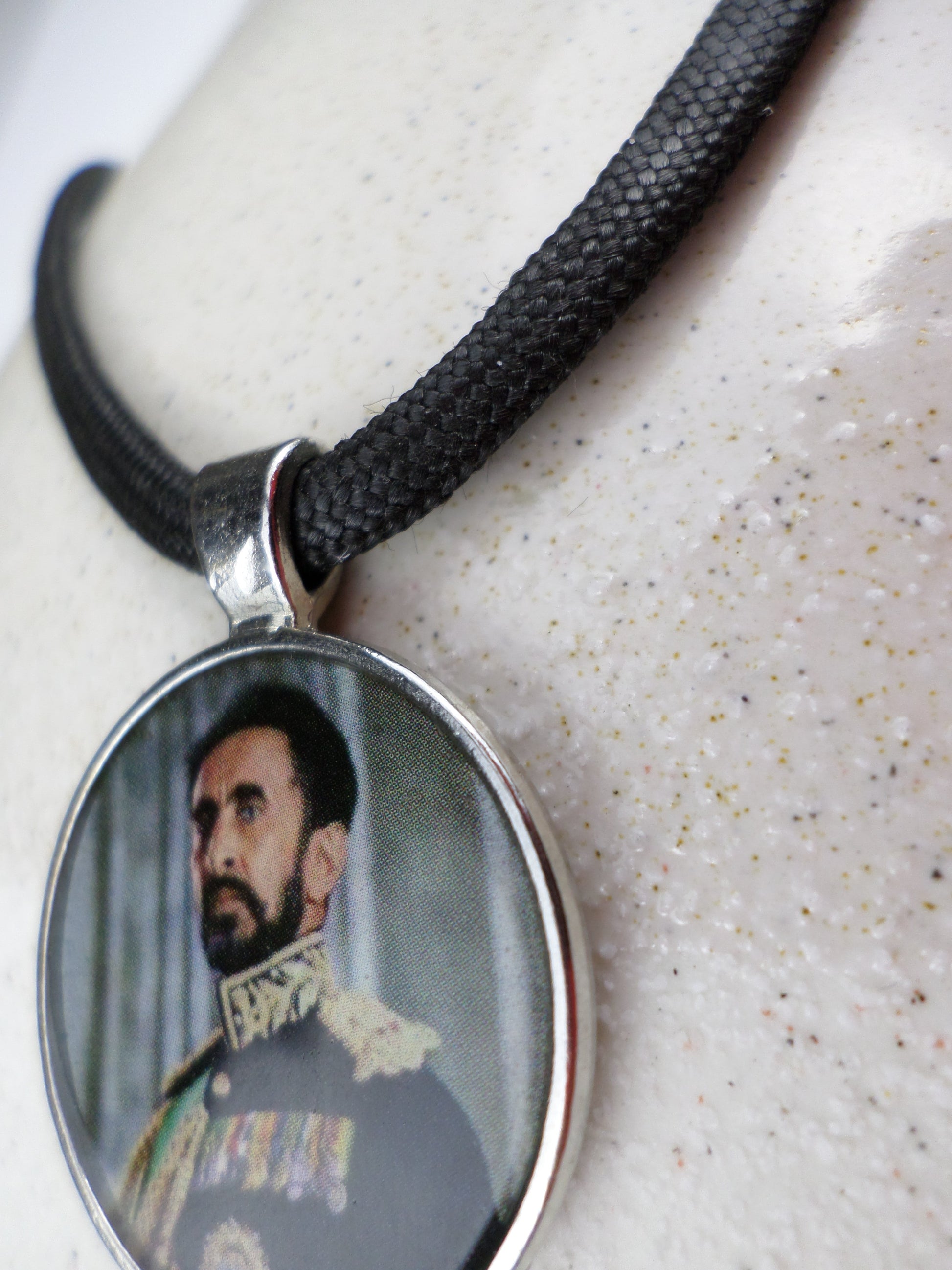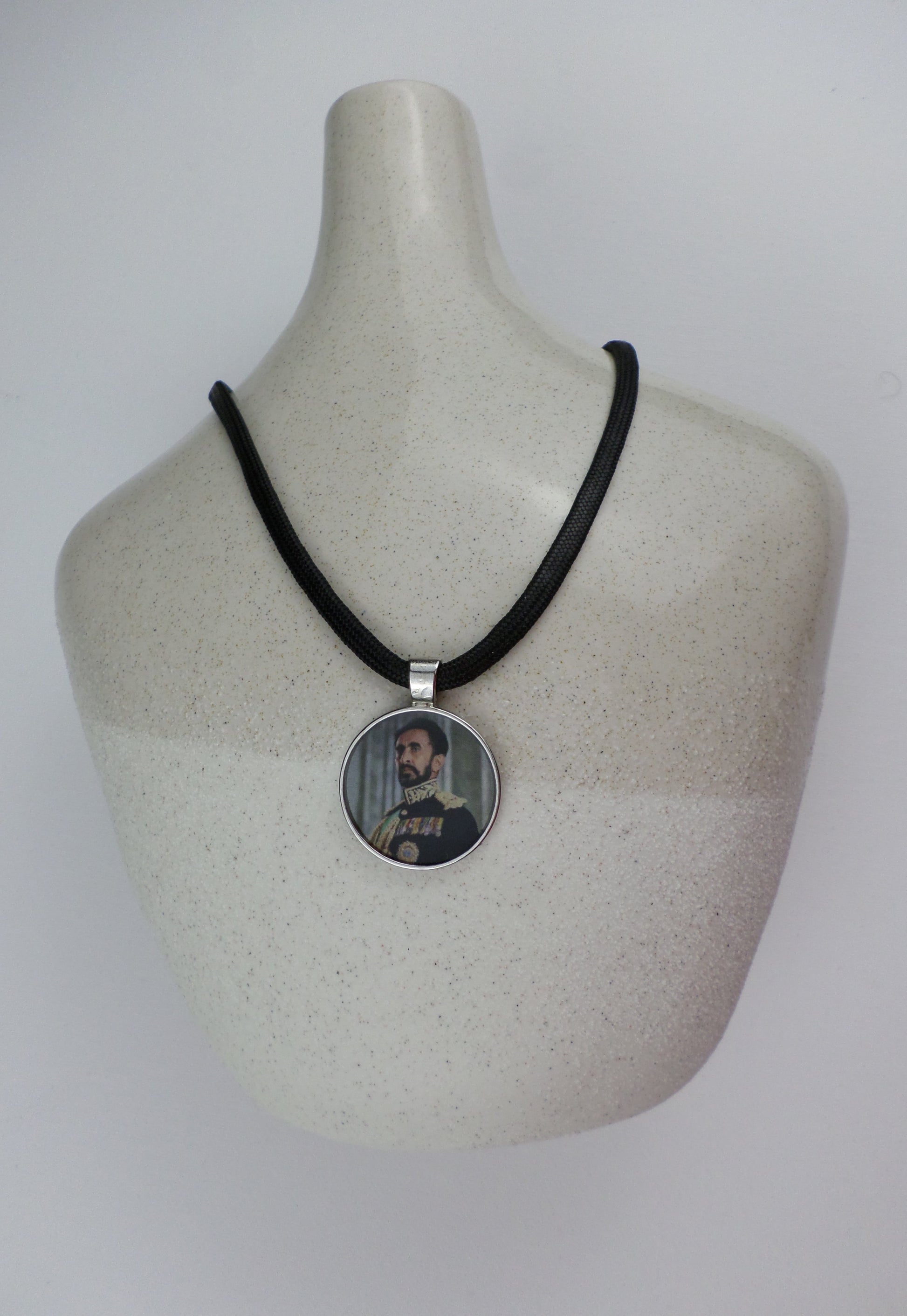 This 24" corded necklace features a resin filled pendant showcasing Emperor Haile Selassie I.